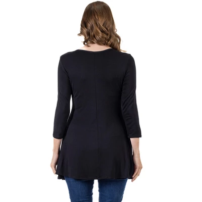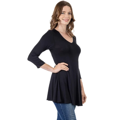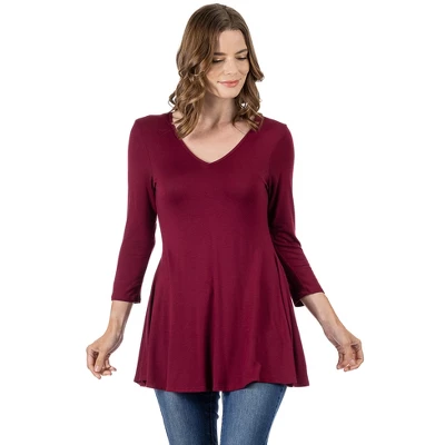 This swingy tunic is crafted with a long tunic fit and a flared silhouette for an easy chic look. With ¾ length sleeves, V-neck, and a comfortable fit this tunic top will become your new favorite! Perfect over leggings or dress it up with pants.