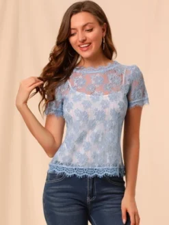 Allegra K Women’s Floral Embroidery Sheer Long Sleeves Lace Blouse