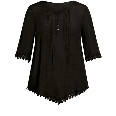 Make the most of sunkissed days in the charming and refreshing Ellie Pintuck Lace Top. As well as crochet lace trim and a button bodice detail, you can’t go wrong with this stunner. Everyday style made easy, Avenue is your one-stop-shop for plus size fashion. Inspired by a comfort-meets-style approach, this effortless brand marries relaxed silhouettes with dynamic prints and colors. From casual daywear to staple denim, Avenue has simplified your everyday dressing. Take your day-to-day look to new heights with comfortable basics or eye-catchingly printed pieces, all designed to keep you comfortable while flaunting your curves to perfection. Available in sizes 14 – 40.